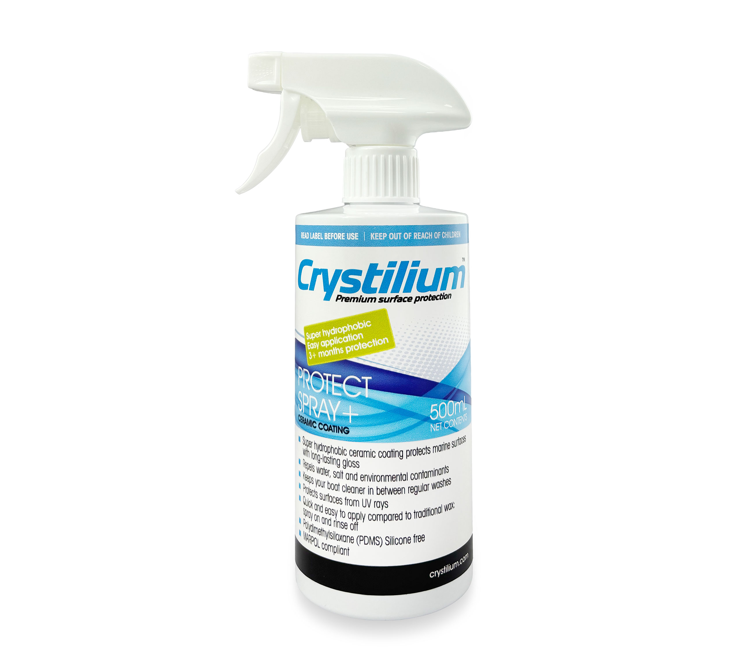 Crystilium Protect Spray+ is a super hydrophobic ceramic coating that protects marine surfaces leaving a long-lasting gloss finish. This quick and easy-to-apply formula repels water, salt, and environmental contaminants while protecting surfaces from UV rays.